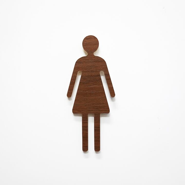 女子トイレピクト 壁付けサインです。透明アクリルにシートが貼られています。中の人型とは別に外枠にも両面テープが貼られてますので、外枠もサインとして使えます。