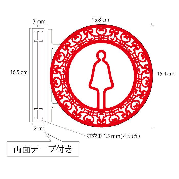 おしゃれな柄で縁取られた、女子トイレマークの突き出しサインです。