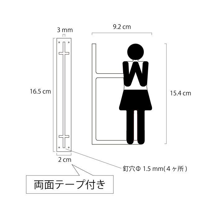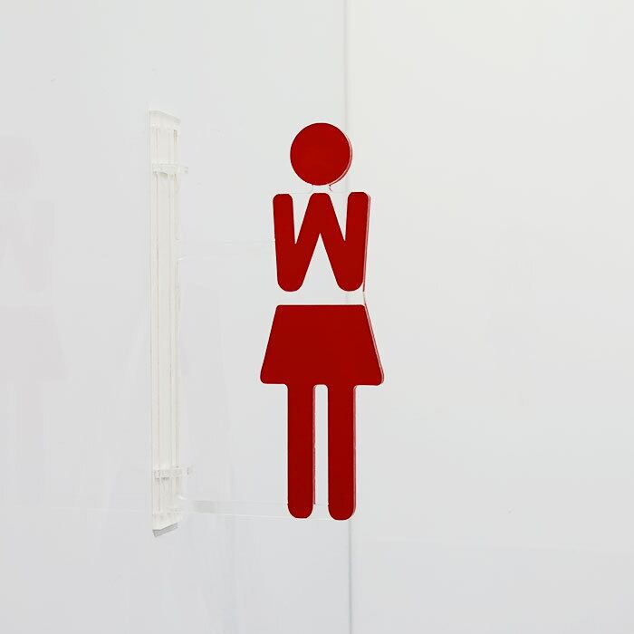 Wの文字が特徴的なピクトトイレサインです。透明アクリルを使用し、ピクトのみ色が付いているので、まるでピクトが浮いているようにも見えます。誰でも組立設置が簡単。両面テープ接着。