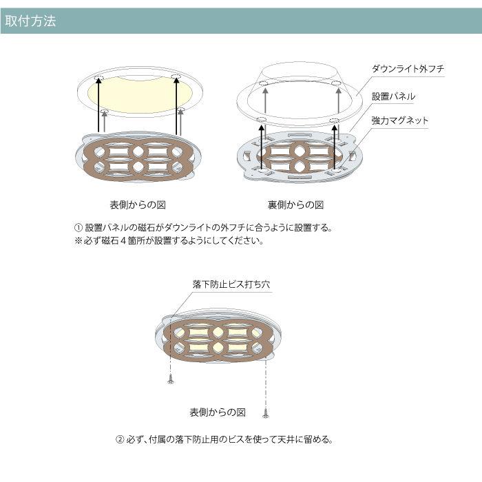 ・必ずダウンライトの外フチ(トリム)が金属の物にご使用ください。磁石で接着しますので、金属以外の物(磁石が付かない物)には設置出来ません。