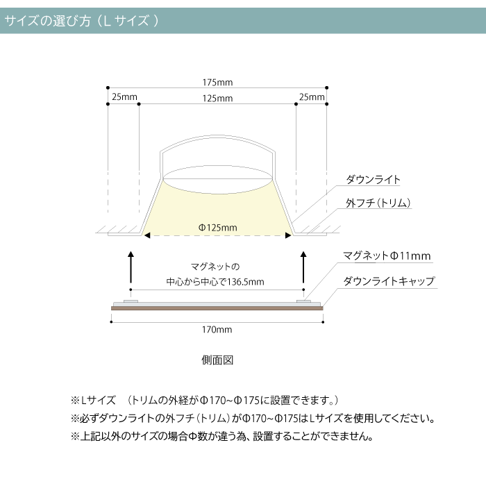 ・ダウンライトの外フチ(トリム)の外径サイズが次の物を使用してください。『Φ170~175』はLサイズ、『Φ150~153』はMサイズ、『Φ110~113』はSサイズを使用してください。それ以外のサイズの場合は、Φ数が違う為、設置することが出来ません。