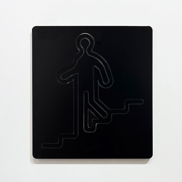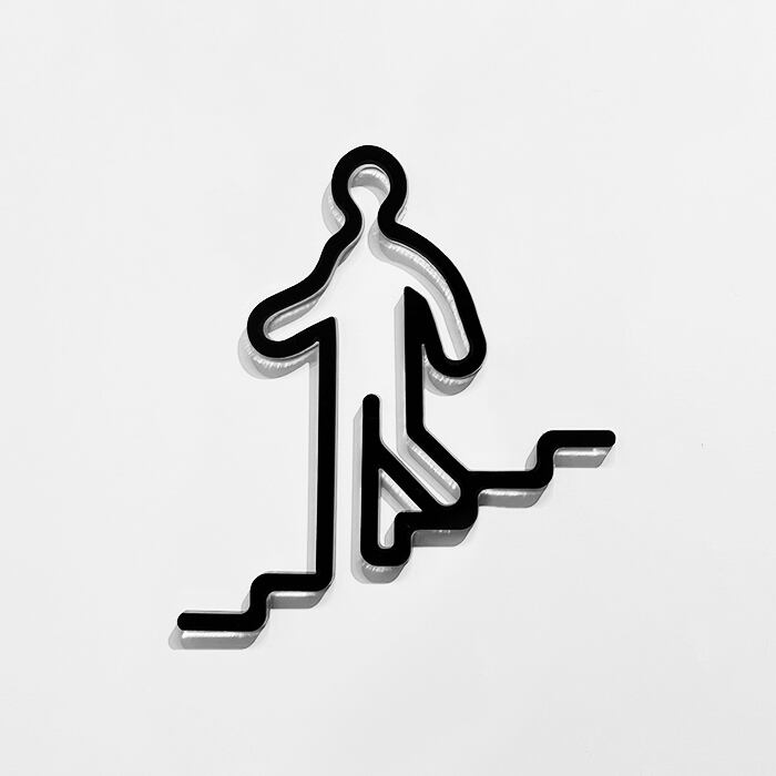 階段下りピクト 壁付けサインです。透明アクリルにシートが貼られています。